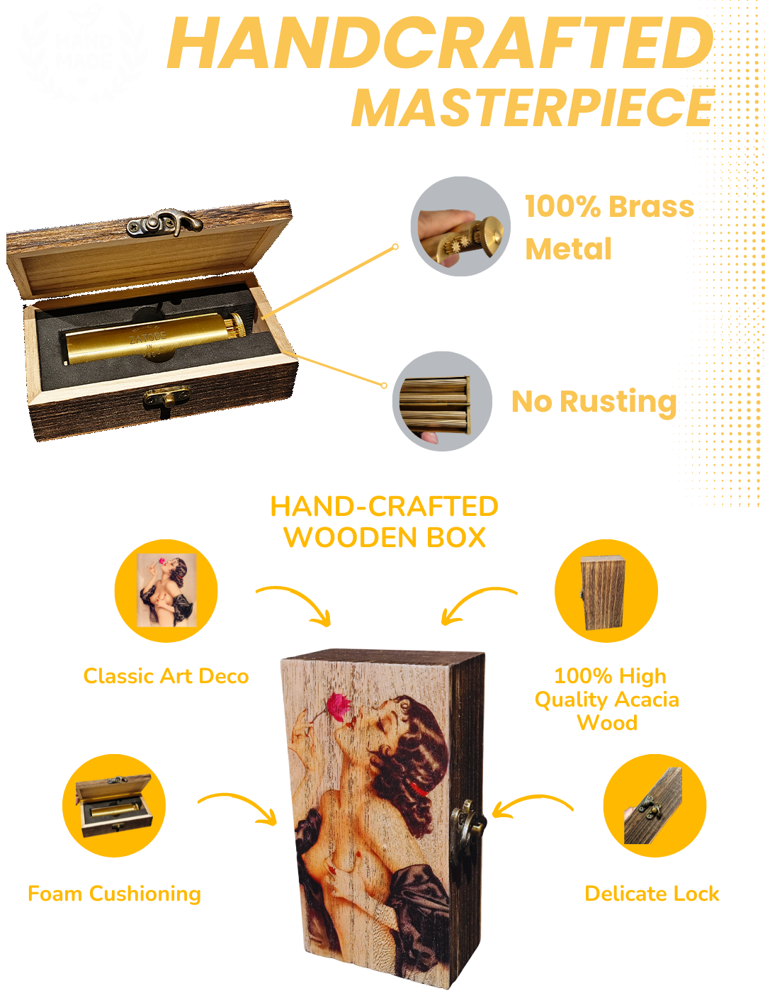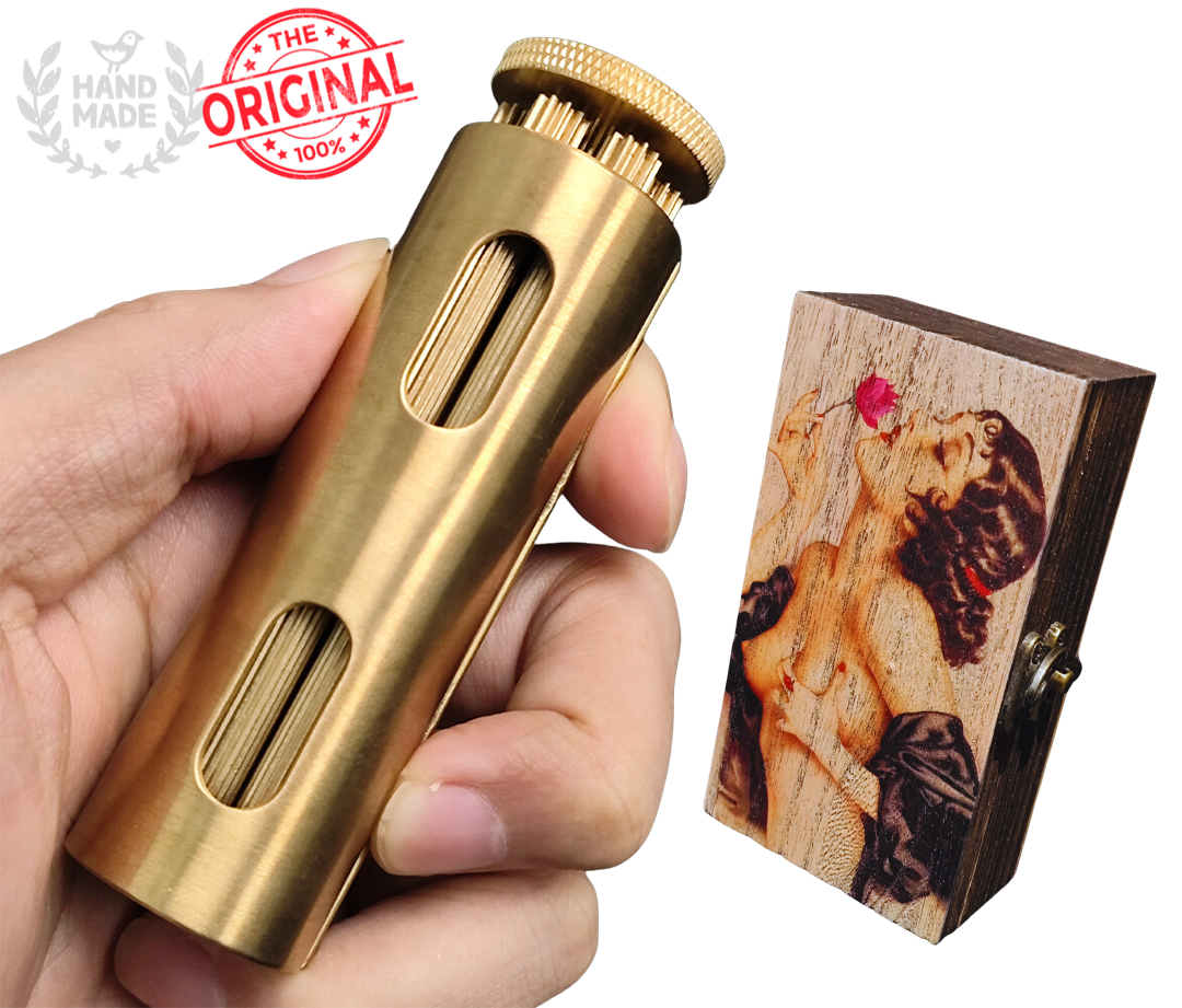 Cute, unique, sassy wooden box that adds a little style to your personal effects. This handcrafted brass masterpiece weighs a substantial half a pound, effortlessly creates perfectly rolled cigarettes, and a great gift for friends who struggle to roll.